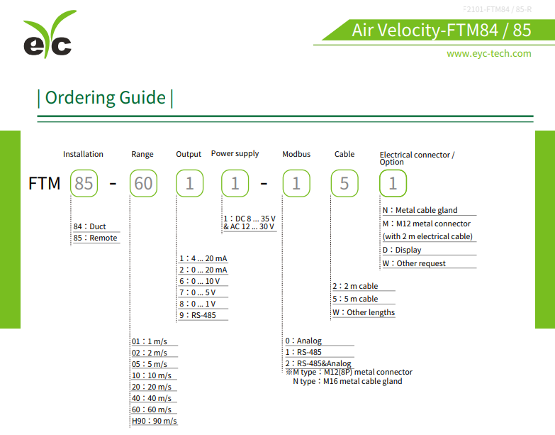 Sensor Type:Thermal mass flow sensor Air Velocity Measuring Range:0.15 ... 90 m/s Air Velocity min. Measuring Range:0.15 m/s Temp. Sensor / Measuring Range:Pt1000, 0 ... 80°C Accuracy(+25°C):Air velocity:±1.5%F.S. Output:0 ... 20 mA / 4 ... 20 mA / 0 ... 1 V / 0 ... 5 V / 0 ... 10 V Display:Optional