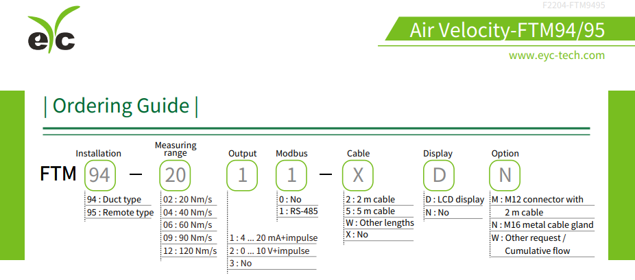 Input type:Pt20 / Pt300(Air velocity), Pt1000(Temp.) Measuring range:0 ... 120 Nm/s Output signal:4 ... 20 mA / 0 ... 10 V / RS-485 / Impulse Accuracy:±1.5% Installation:Duct type / Remote type IP rating:IP67
